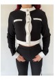 • Üst Detayları: Üst kısım, dik yakalı ve önü yuvarlak, kontrast renkli düğmelerle kapanan bir hırka/ceket tarzındadır. Omuzda ve göğüste dekoratif beyaz paneller bulunur.
