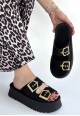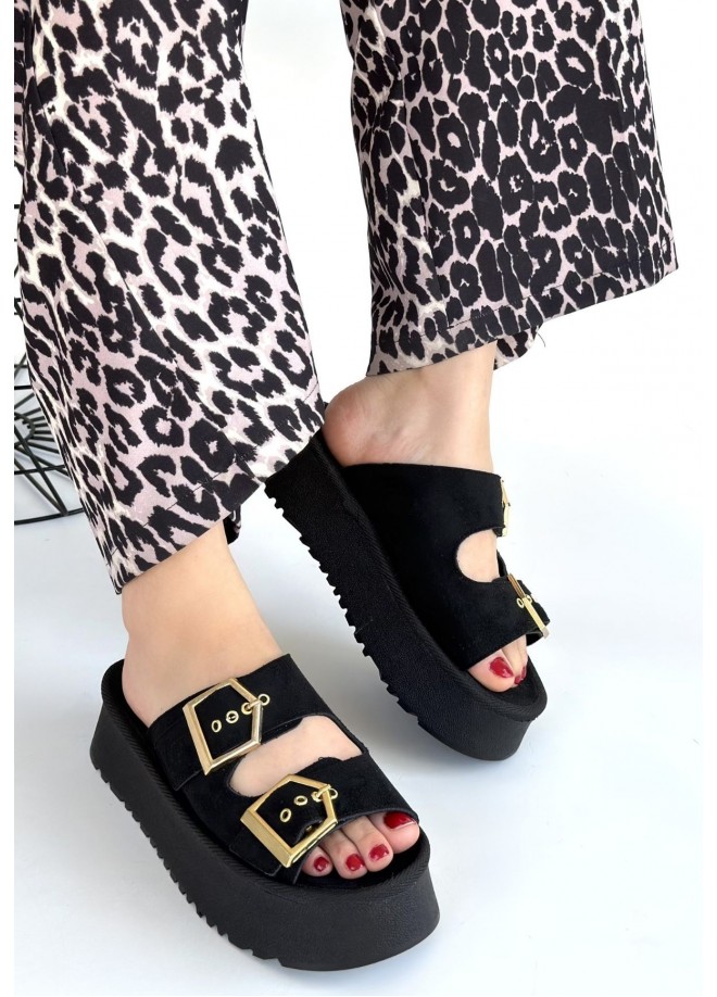 Coer Siyah Süet Çift Tokalı Terlik