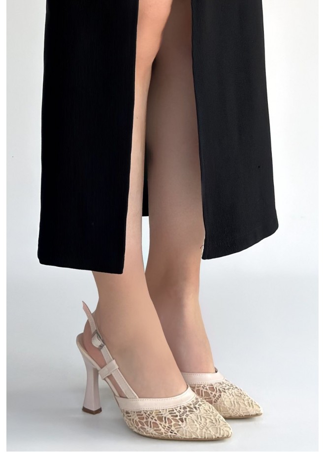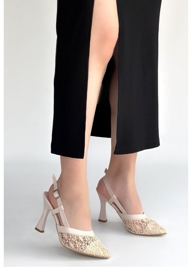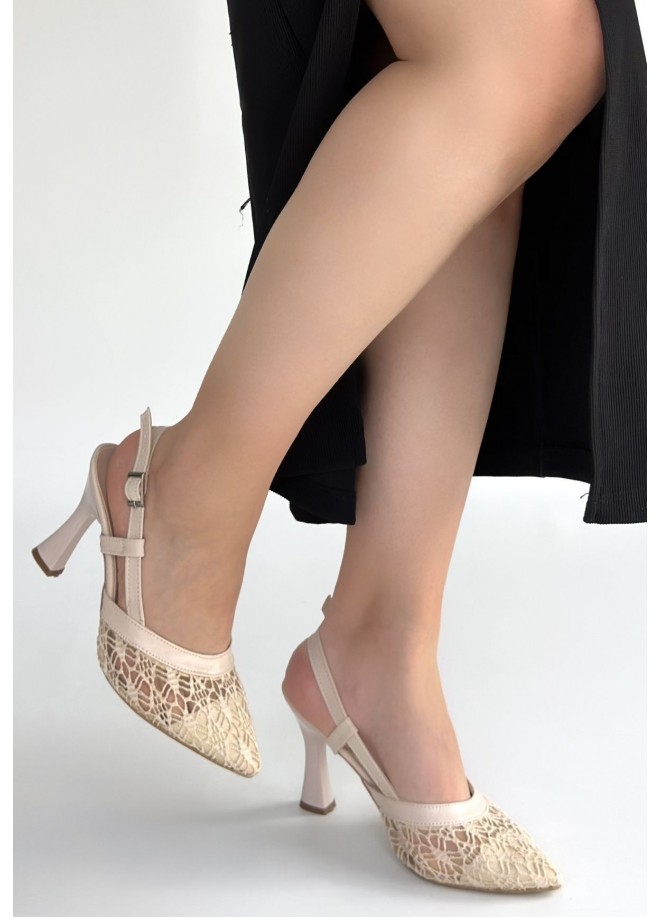 Ceta Bej Cilt Tül Detaylı Topuklu Ayakkabı