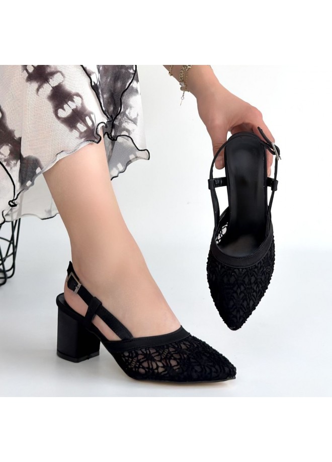 Poje Siyah Saten Tül Detaylı Topuklu Ayakkabı