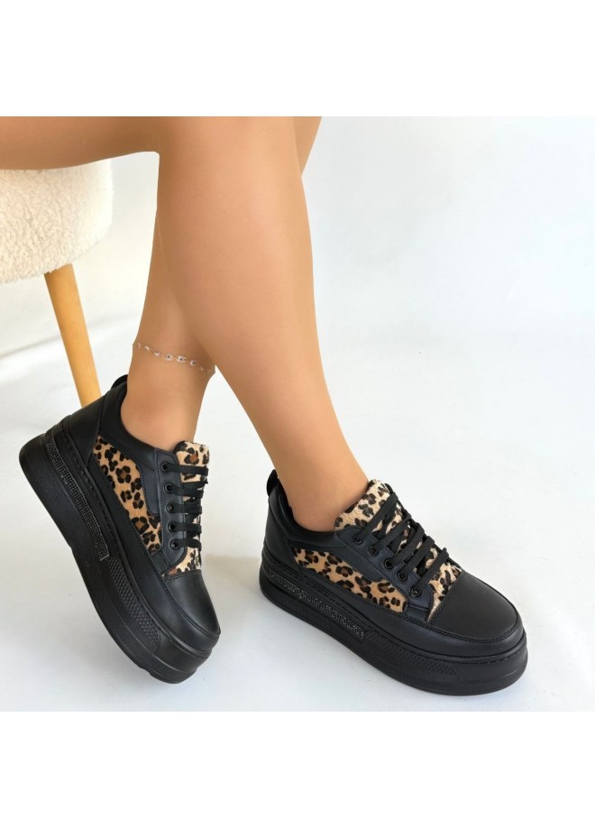 Lorrin Siyah Cilt Leopar Detaylı Bağcıklı Spor Ayakkabı