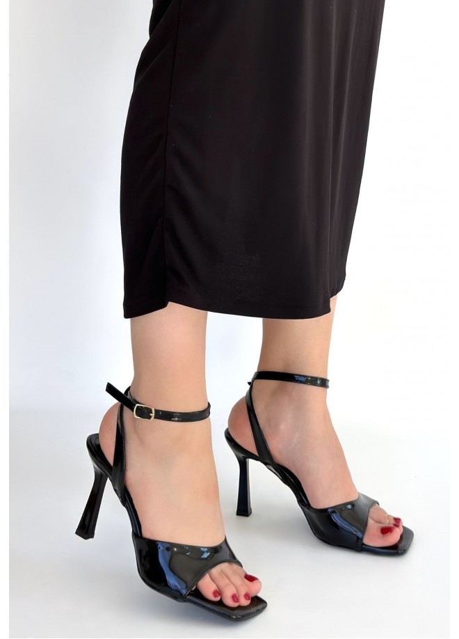 Soha Siyah Rugan Topuklu Bilekten Kemerli Ayakkabı