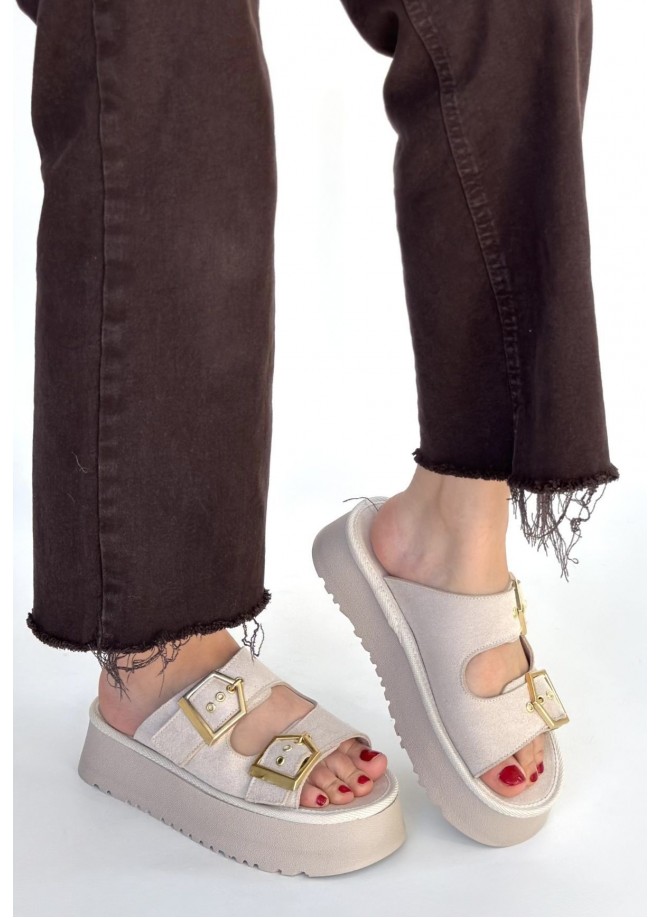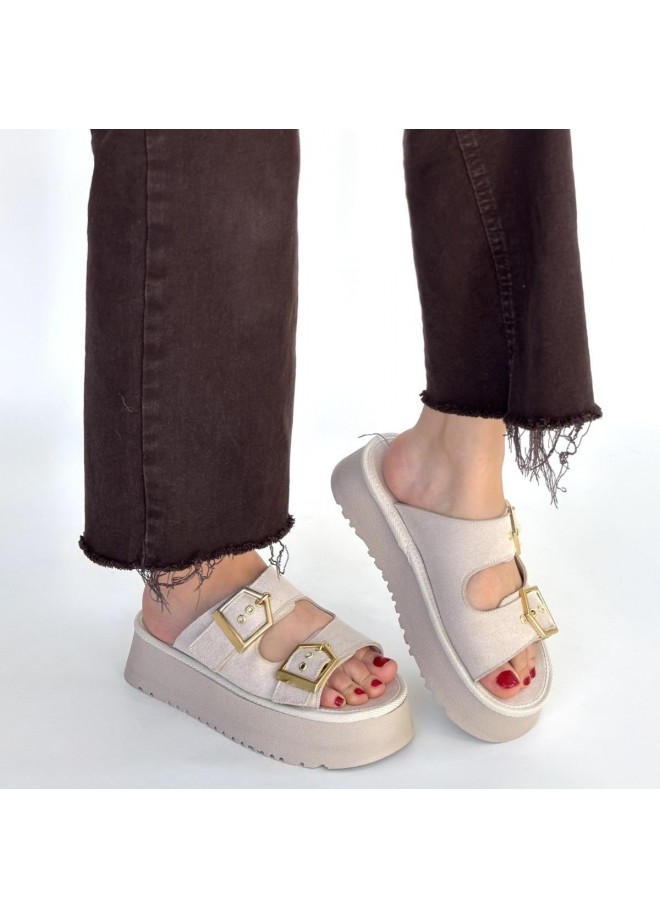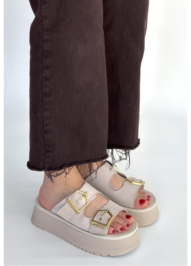 Coer Bej Süet Çift Tokalı Terlik