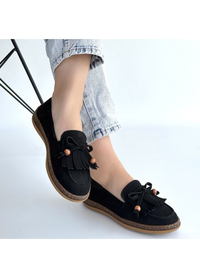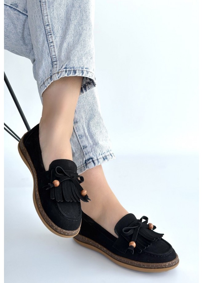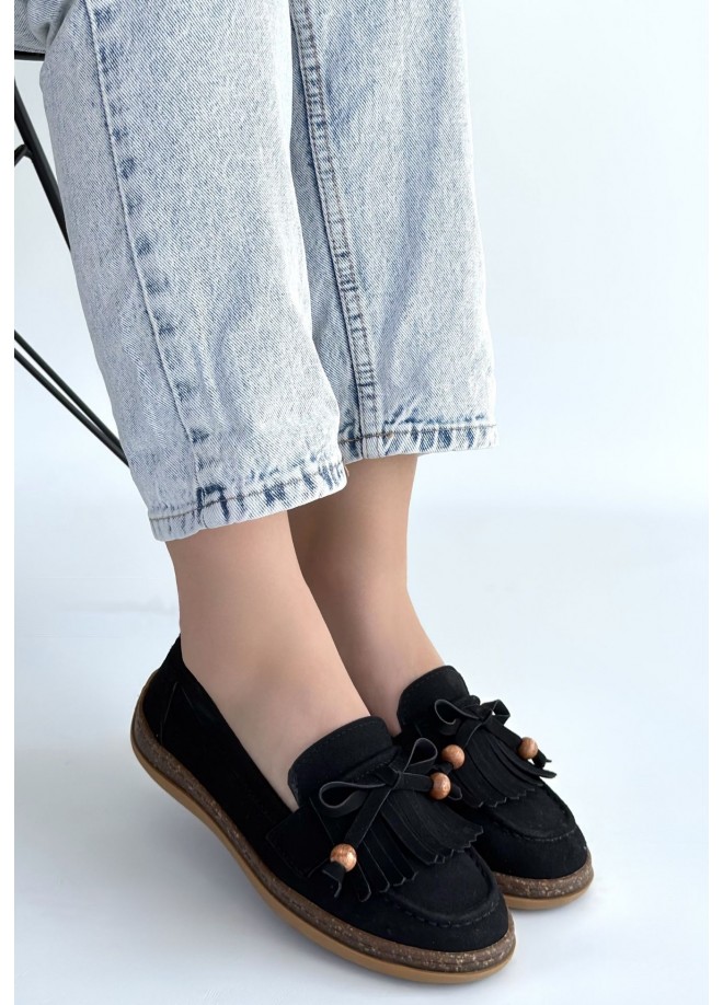 Boriy Siyah Deri Tozu Süet Babet Ayakkabı